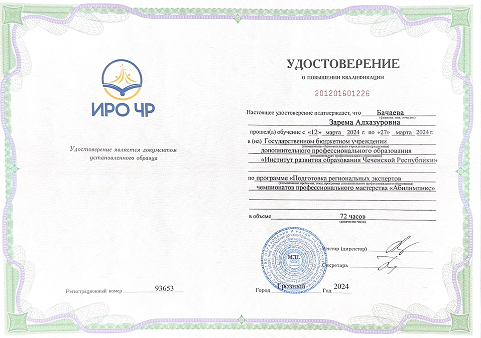27.03.2024Преподаватель Шалинского государственного колледжа Бачаева Зарема Алхазуровна прошла курсы повышения квалификации в ГБУ ДПО «Институт Развития образования Чеченской Республики» по программе: «Подготовка региональных экспертовчемпионатов профессионального мастерства «Абилимпикс».